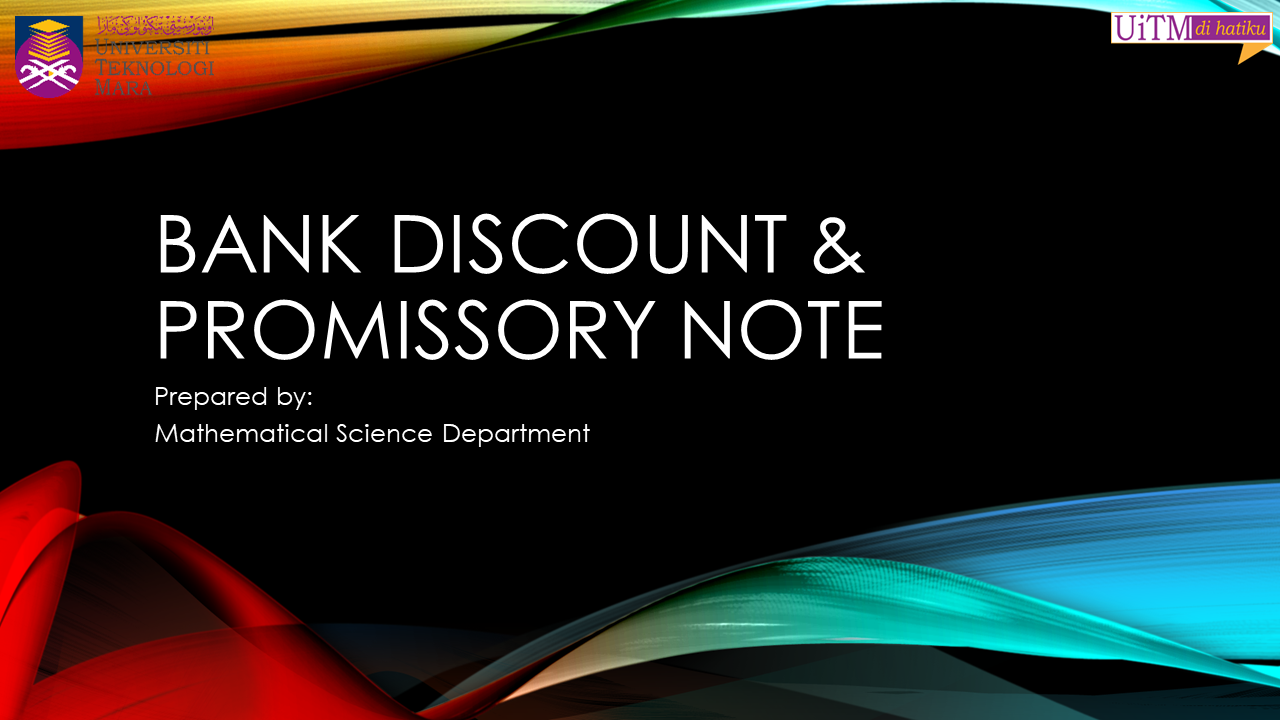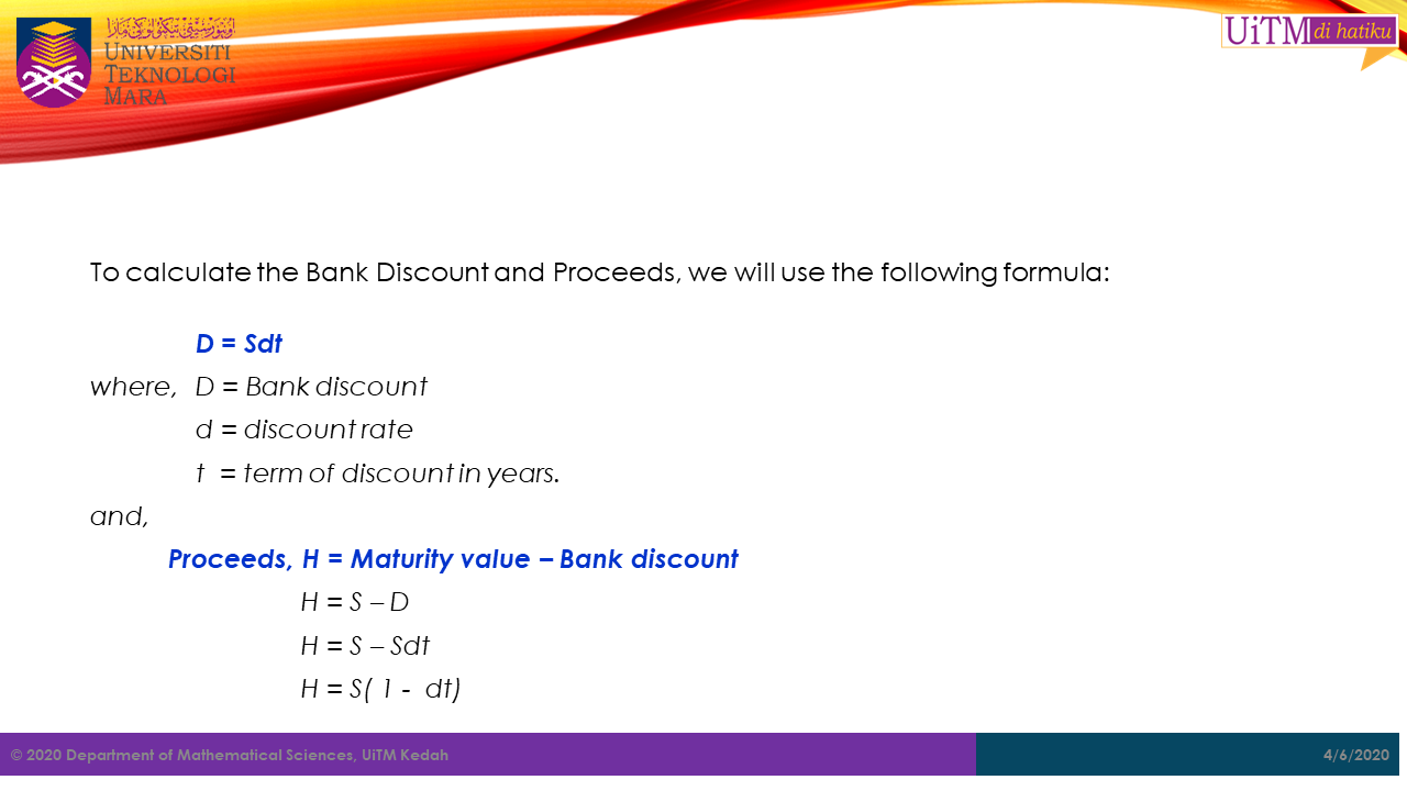 It is a common practice by the bank to deduct charges from a loan in advance. This charges is called bank discount. Note that in bank discount it is different from the case of simple interest. In simple interest, the amount of maturity value is more than the amount borrowed. In addition, normally in the beginning you have an amount that eventually will be more after certain time period, such that the present value is lower than the future value. However, in bank discount it is the other way around. Thus, in bank discount, the amount borrowed is actually the maturity value, not the principal or the present value.