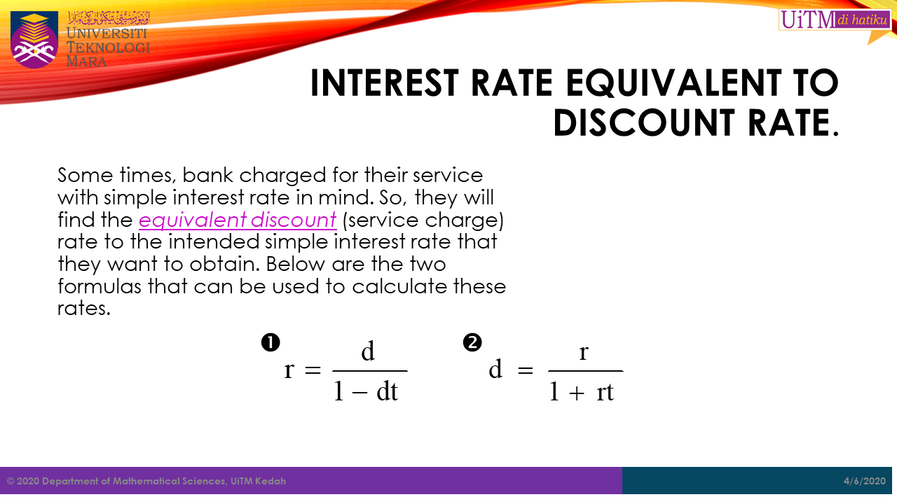 Sometimes, bank charged for their service with simple interest rate in mind. So, they will find the equivalent discount (service charge) rate to the intended simple interest rate that they want to obtain. Below are the two formulas that can be used to calculate these rates.