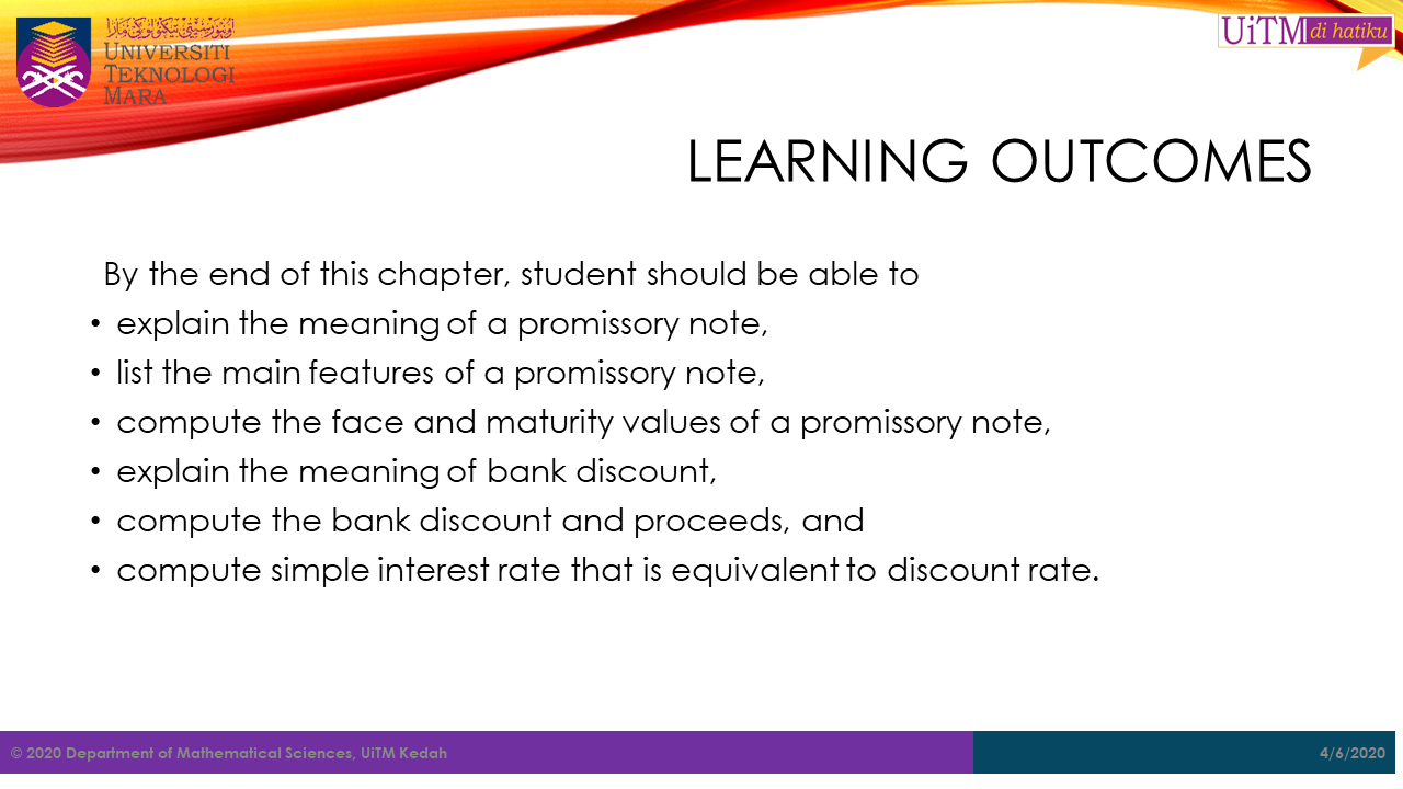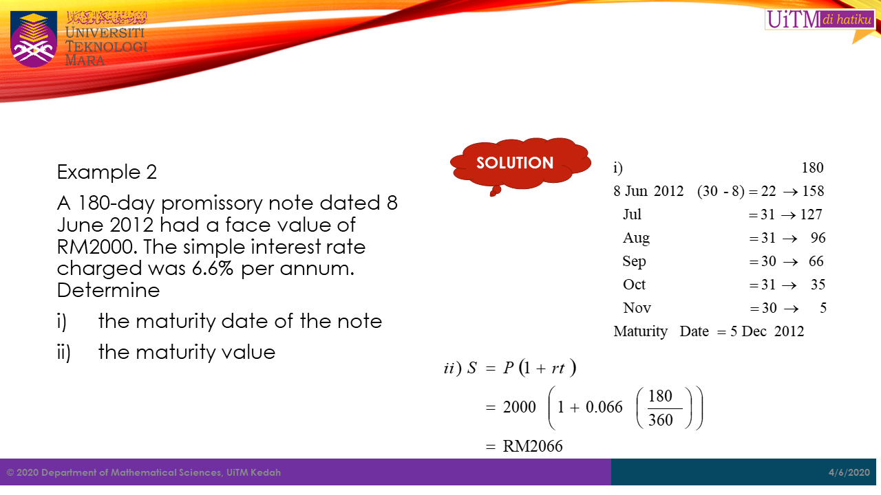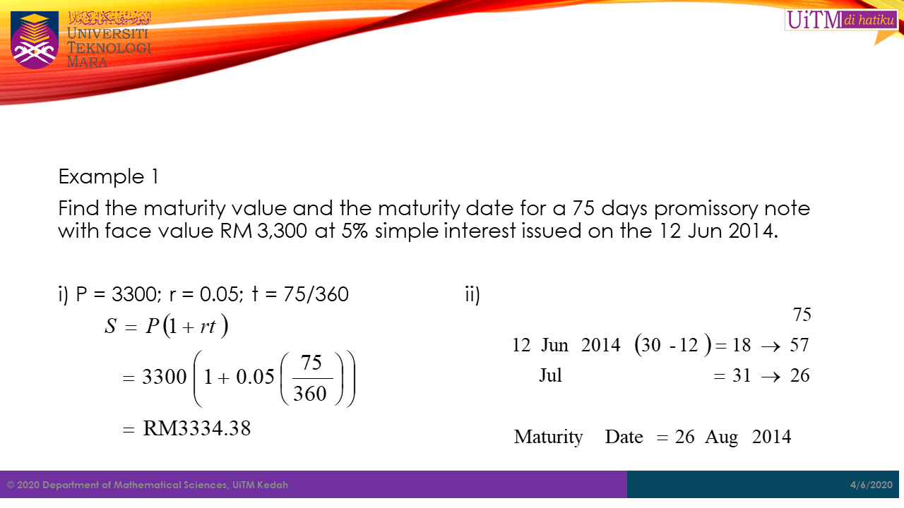 Abu received a 180 day promissory note worth RM4500 at 8.5% simple interest on 14th August 1999 from Sahara. However, on 24th November 1999 Abu sold the note to a bank at the discount rate of 7.5%.