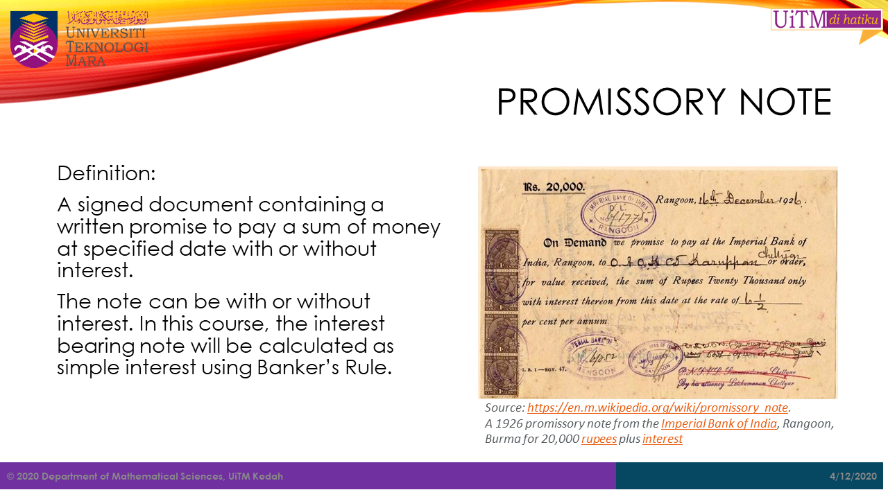 A 1926 promissory note from the Imperial Bank of India, Rangoon, Burma for 20,000 rupees plus interest. Retrieved from https://en.m.wikipedia.org/wiki/promissory_note.