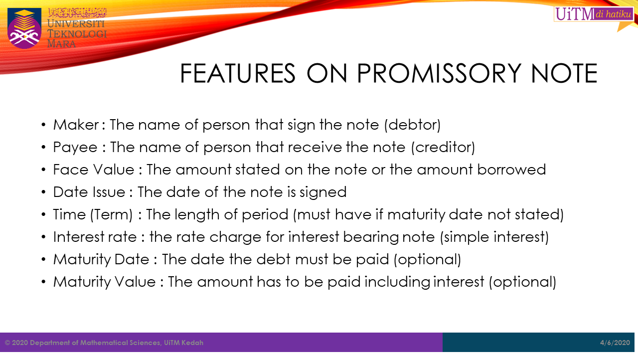 This promissory note that Chris has you sign is not just a sticky note saying that you will pay back the RM500,000 at some time in the future. This note goes into detail. It contains the terms or conditions that you will follow to pay back this large amount. It includes the interest rate that the bank charges you for borrowing money. This is how the bank makes money off of this transaction. It also includes the payment’s terms, such as when you are going to make payments and when the final payment will be made and the loan fully paid off.