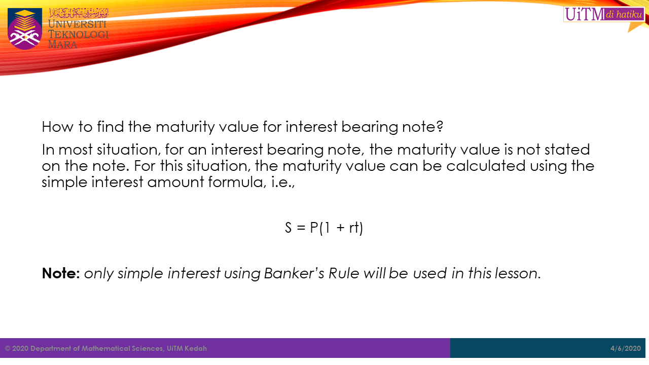 In most situation, for an interest bearing note, the maturity value is not stated on the note. For this situation, the maturity value can be calculated using the simple interest amount formula, i.e.,