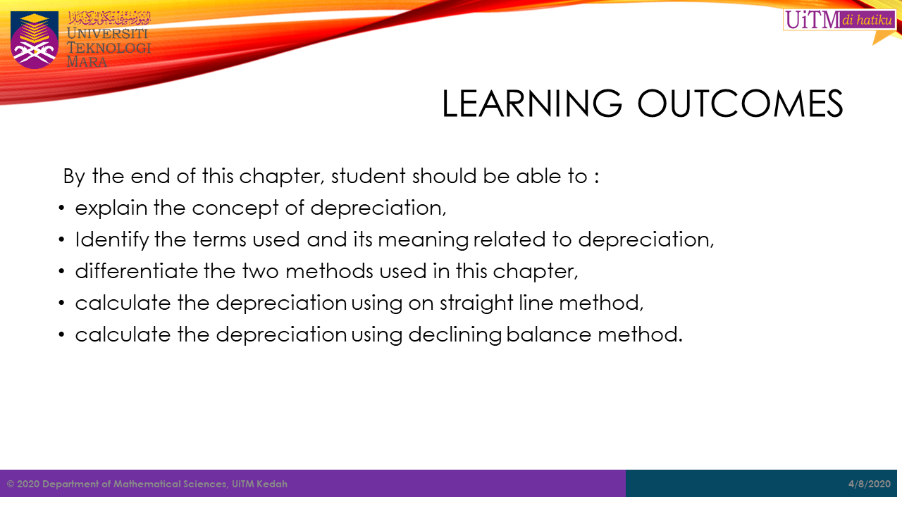In this chapter, student will be introduced to the fundamental concept of depreciation. It started with the answer to what is depreciation is? Some important terms with its meaning will be explain to the students. Finally, the cahpter will discuss on the two methods of depreciation calculation that will be covered in this chapter. Examples with solution will be provided to guide the students understanding on this topic.
