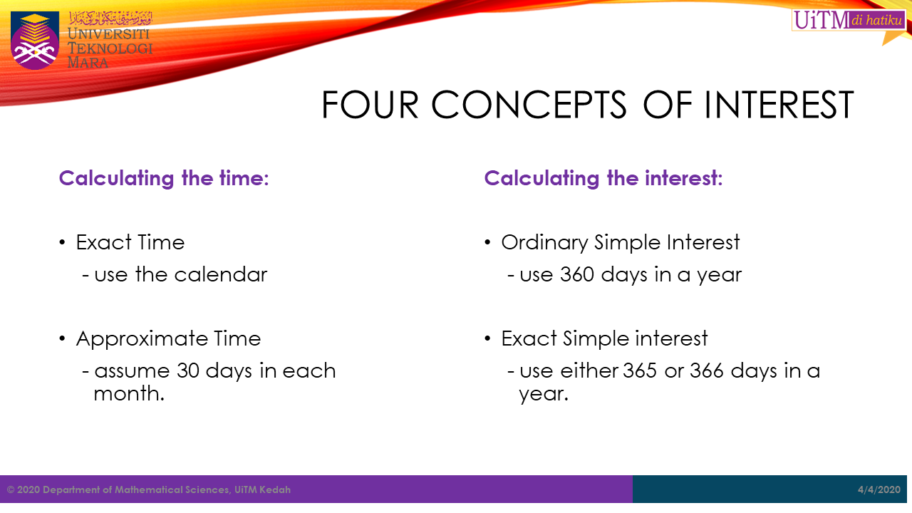 There are two ways in which interest is calculated, namely the exact simple interest and the ordinary simple interest.