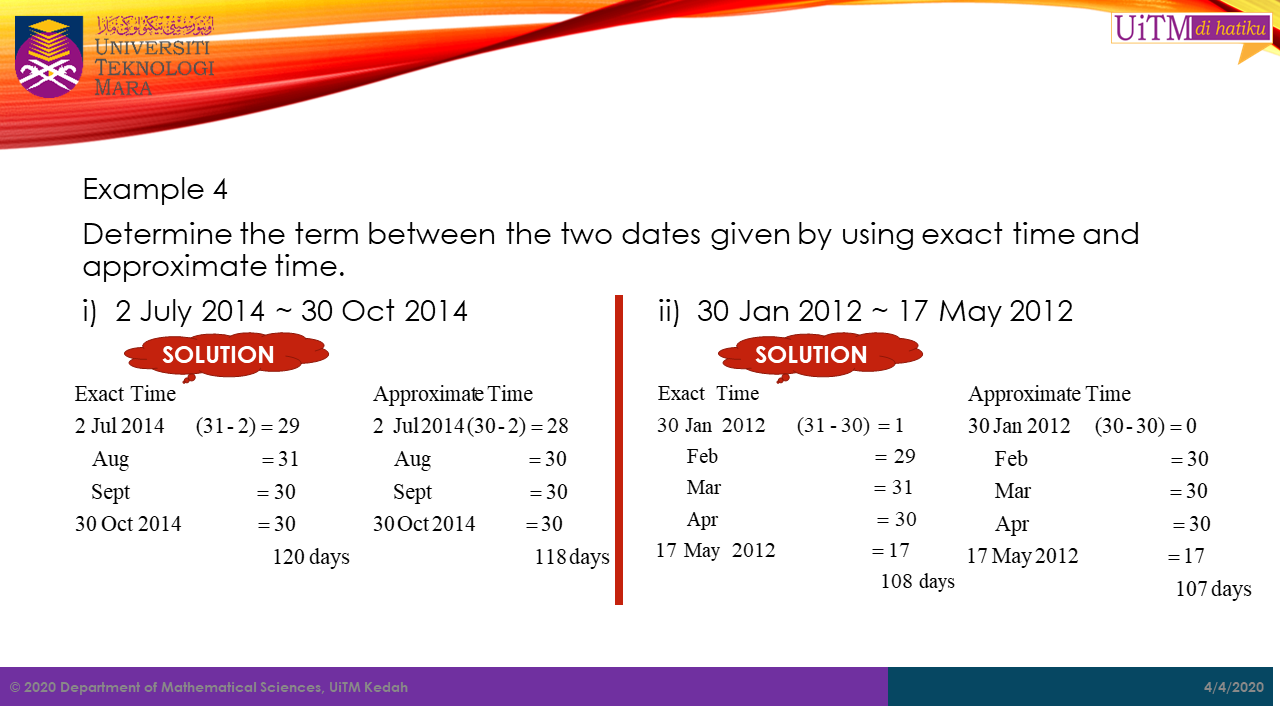 When dates are given, the number of days between the two dates is calculated in two ways. Those two ways are exact time and approximate time.