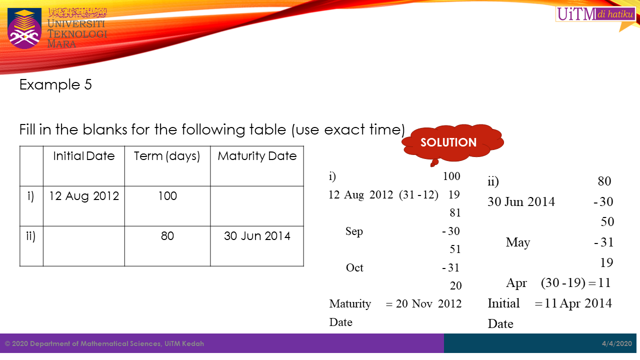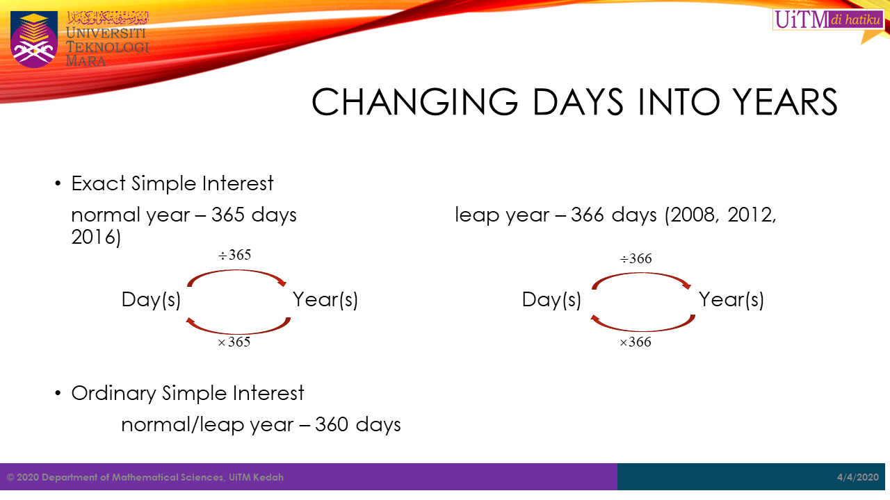 Sometimes the duration or term period is given in the form of the time between one date to another. For example, certain amount of money was invested in a mutual fund on \(3^{rd}\ January,\ 2020\) will mature on the \(28^{th}\ April,\ 2020\). Thus, there are ways to calculate the \(t\) value based on the for concepts mentioned below.