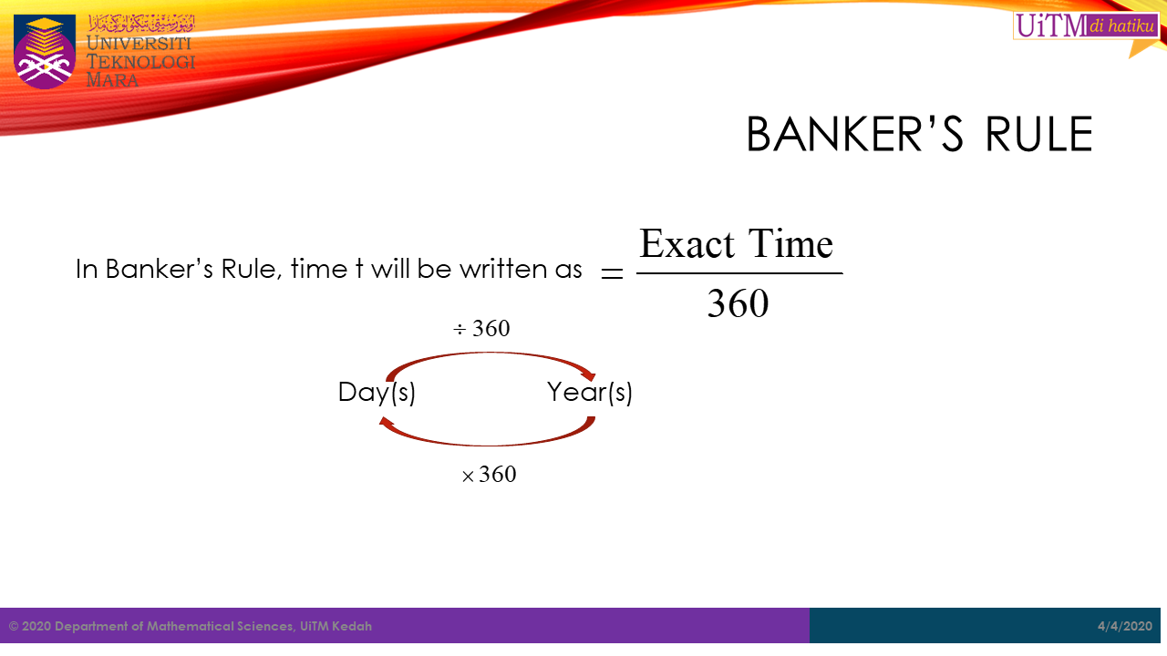 \[ Banker's\ Rule\ =\ \frac{Exact\ Time}{360} \]