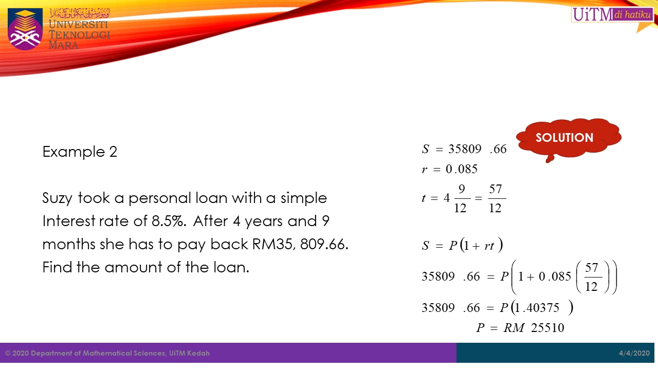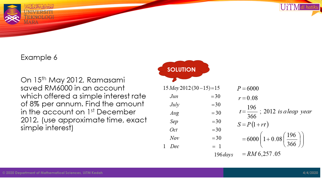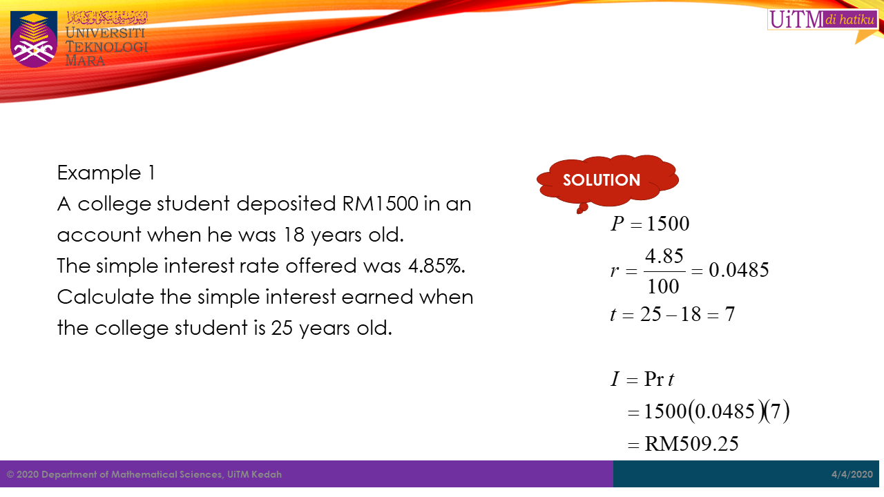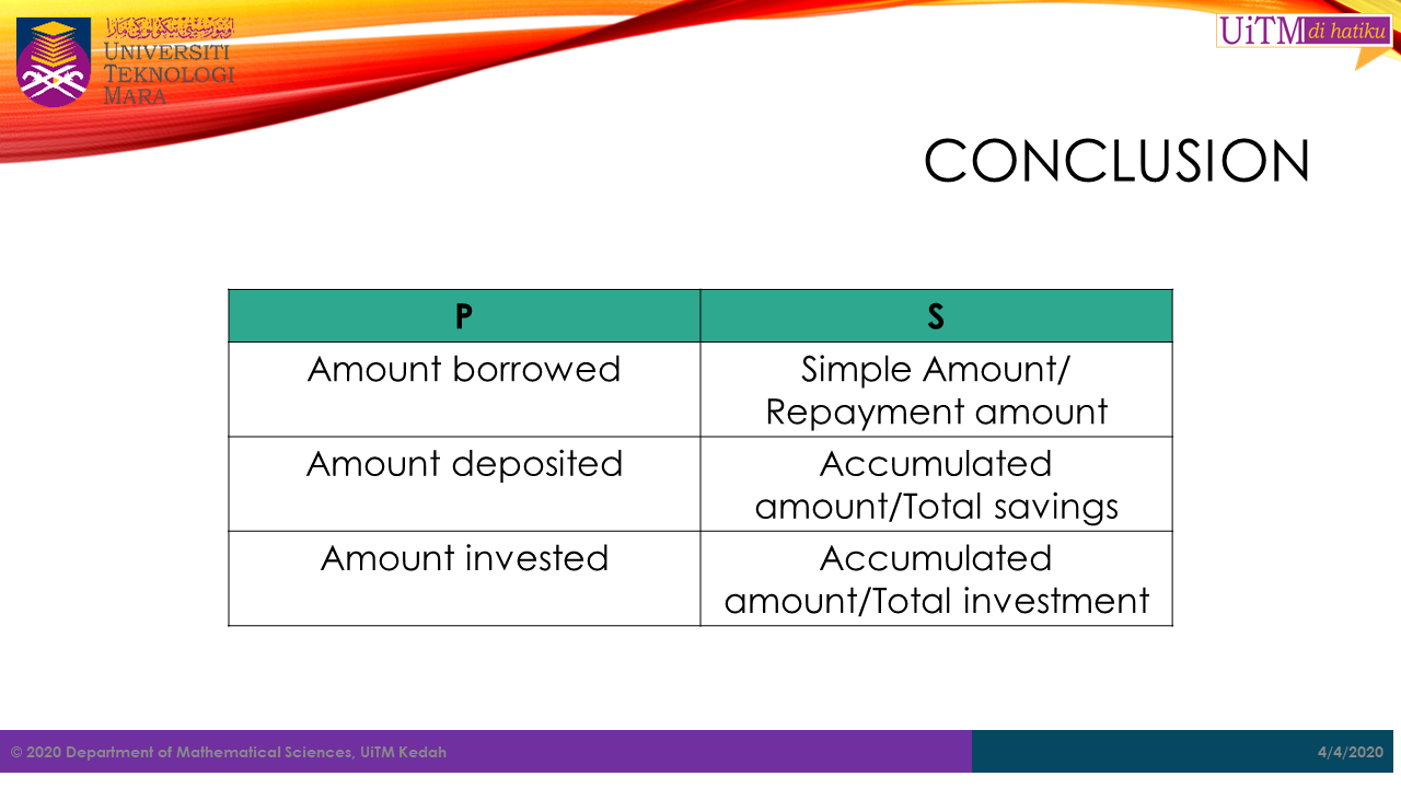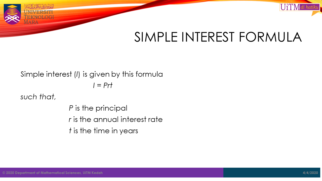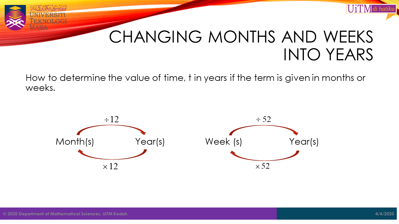 Note: The value \(t\) in both formula above must be in years. Hence, for any period given not in years, it must be converted into years. For example, if the period is in months, then \(t\ =\ \frac{number\ of\ month}{12}\).