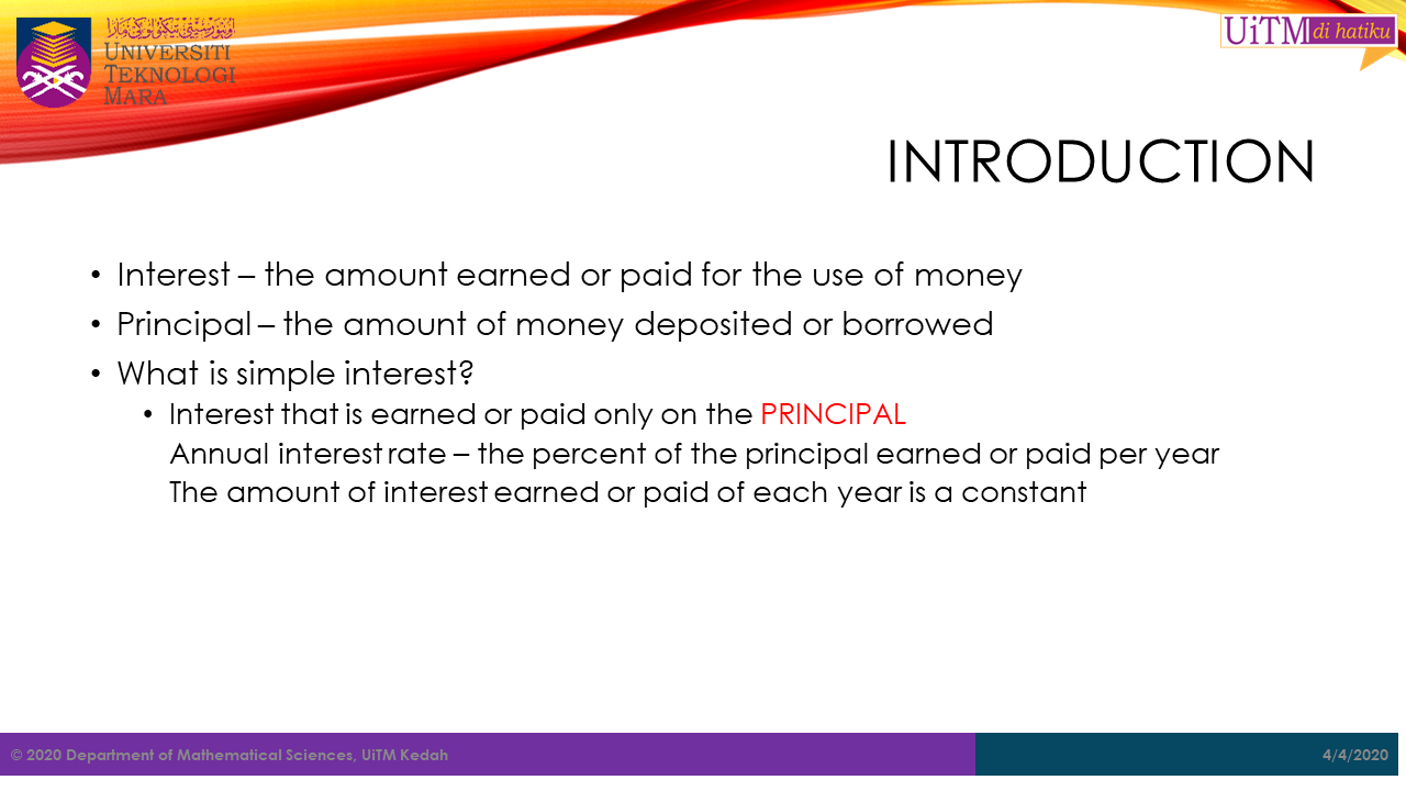 Simple interest is the interest due at the end of a term. In simple interest transaction, only the principal (original value) will earn the interest. The principal can be the amount of money deposited in an account or the amount of money borrowed.